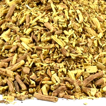Sušený, řezaný kořen šišáku bajkalského (Scutellaria baicalensis Georgi).