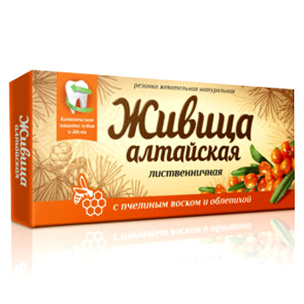 Čištění zubů, posílení dásní. Očištěná pryskyřice z modřínu sibiřského, včelí vosk, extrakt z plodů rakytníku.