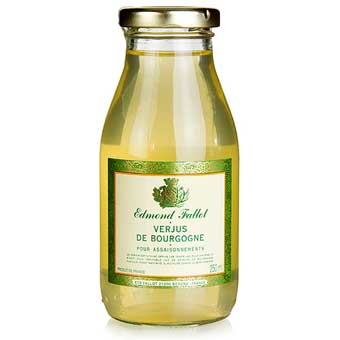 Verjus z Burgund, Fallot, 250 ml. Verjus (v překladu zelená šťáva) je mošt z nezralých hroznů. Až do 17. Století byl "Verjus" tradiční prostředek na okyselení v evropské kuchyni, ale pak díky obchodování s citróny upadl do zapomnění.